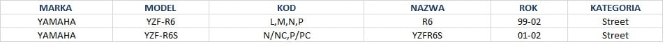 Zastosowanie: YAMAHA YZF-R6, YZF-R6S, FZ600S szczegóły w zakładce „pasuje do” i tabelce poniżej