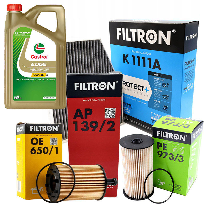 Olej silnikowy CASTROL 5W30 EDGE 15F7EC 5l + Filtron Filtr Kabinowy K1111A Filtr Paliwa PE973/3 Filtr Powietrza AP139/2 Filtr Oleju OE650/1